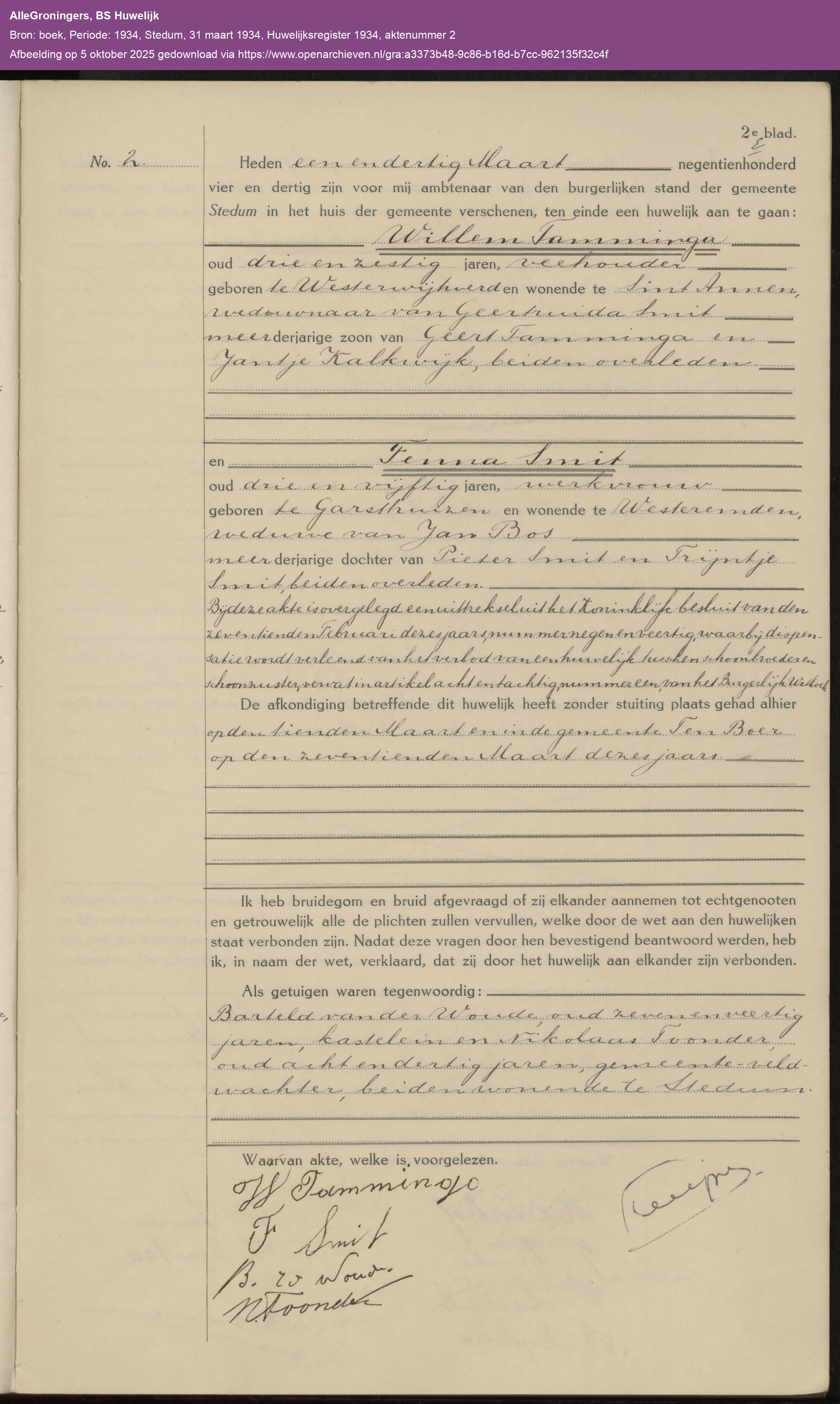 | Huwelijk | 31-03-1934 | Stedum (groningen) | 2e huwelijk met Fenna Smit | |